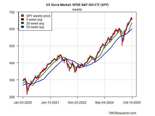Let’s start by reviewing a popular measure of stocks writ large via the SPDR S&P 500 ETF (SPY). To suppress some of the noise, weekly data is used (here and throughout). Despite the alarming headlines following Friday’s selloff, the weekly setback is still mild. SPY fell below its 5-week moving average, but that’s a routine event that rarely signals a secular decline. A more concerning warning would arise if the 5-week trend (black line in chart below) slides below the 20-week average (green line), which would signal a significant downshift in market sentiment. For the moment, such a shift doesn’t look imminent.