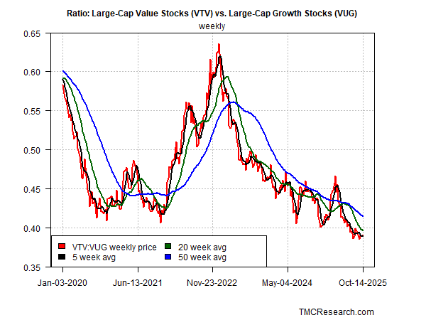 Another check on the S&P 500 trend is comparing how value stocks (VTV) are performing relative to growth shares (VUG). Echoing the historical record with staples stocks, value shares tend to outperform growth during periods of heightened market volatility and stress, a scenario with a rising trend in the VTV-VUG chart below. That was true during the 2022 market correction, but recent history shows that value (VTV) continues to underperform growth (VUG), offering another clue for thinking that the broad market’s primary trend has yet to buckle.