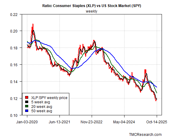 As a check on the sentiment analysis for the S&P 500, it’s valuable to compare the signaling for consumer staples stocks (XLP) relative to the broad market (SPY). In times of elevated market stress, staples tend to outperform stocks overall as investors seek relatively safe havens. In those periods that favor lower risk exposure, this ratio (red line in chart below) is rising. But as the latest data shows, staples continue to underperform the broad market (SPY), which aligns with the S&P 500’s weekly trend noted above.
