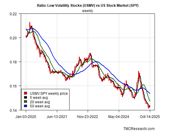 Another lens for evaluating the market’s primary trend is comparing shares that exhibit low volatility (USMV) against the S&P (SPY). Low-vol shares are also considered a defensive subset of the market, which is why they tend to outperform during periods of rising market stress and investor anxiety. In those periods, the USMV-SPY ratio rises. But here, too, the opposite is still unfolding as this ratio trends lower, suggesting this measure of market sentiment has yet to signal a meaningful break in bullish sentiment.
