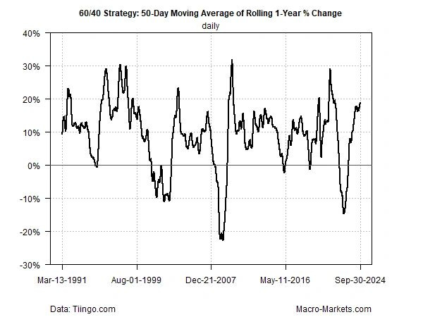 Consider the history of the 60/40 portfolio on a rolling 1-year basis since 1991 (the results are smoothed with a 50-day moving average to highlight the trend’s evolution). Using a set of Vanguard index funds as proxies for US stocks (VFINX) and bonds (VBMFX) indicates that while the strategy suffered recently, the decline wasn’t unprecedented. Nor was the relatively rapid and robust recovery. As of September 30, the 50-day average of the 60/40 portfolio is approaching a 20% year-over-year advance.