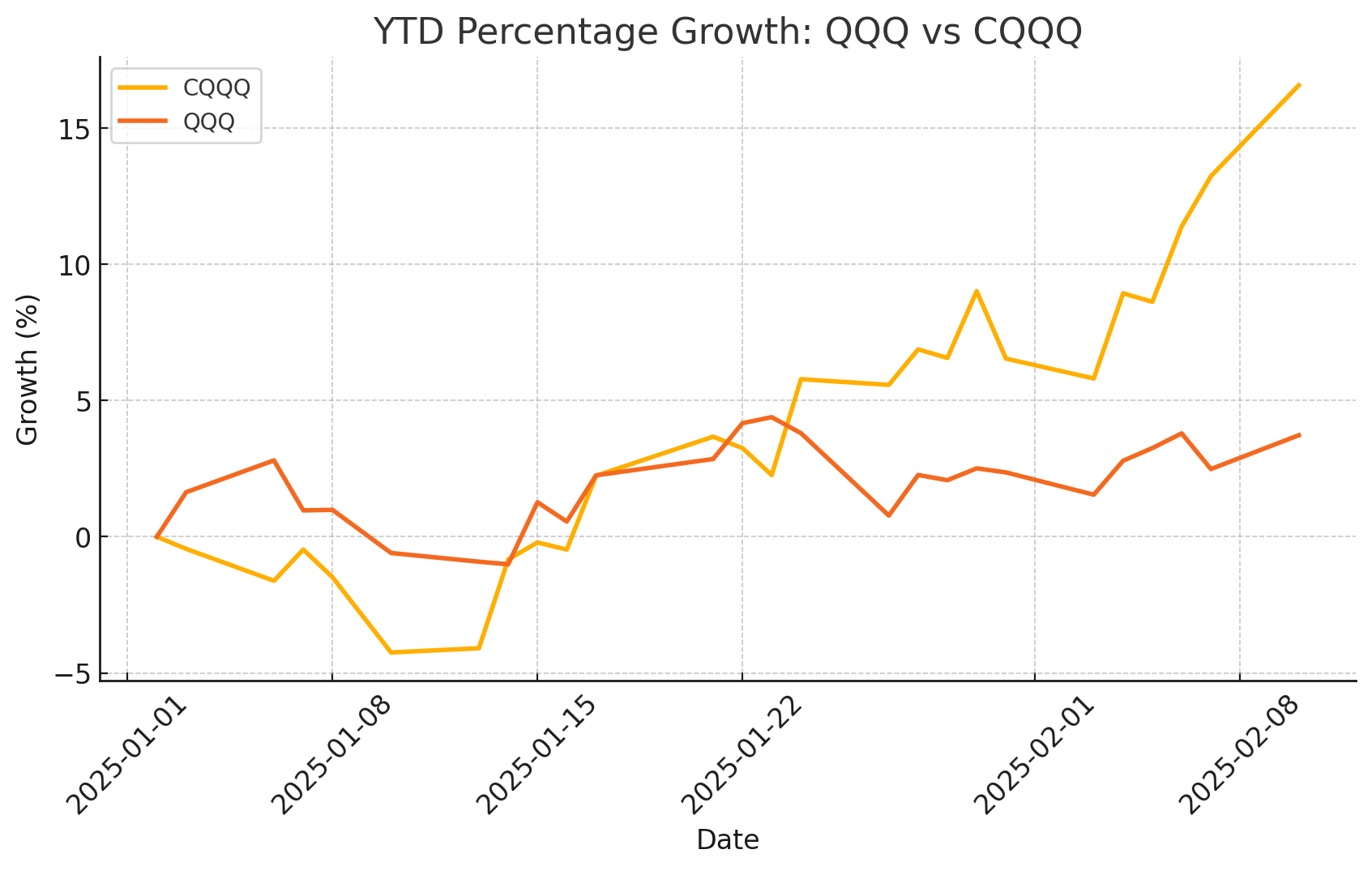 As of February 10, 2025, QQQ holds a modest year-to-date gain of 3.7%. In contrast, CQQQ ended the day, marking a significantly stronger year-to-date increase of approximately 16.6%—nearly five times that of its American counterpart. This divergence underscores growing investor confidence in Chinese tech firms, possibly fueled by breakthroughs like DeepSeek’s and a more supportive regulatory environment.