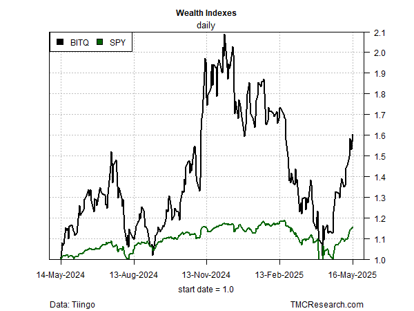 Or so it appears, based on investor sentiment for the business outlook. The Bitwise Crypto Industry Innovators ETF (BITQ), which holds a portfolio of companies operating in the crypto economy, is outperforming the US stock market by a wide margin over the past year with a 56% rally vs. 24% for the SPDR S&P 500 ETF (SPY).