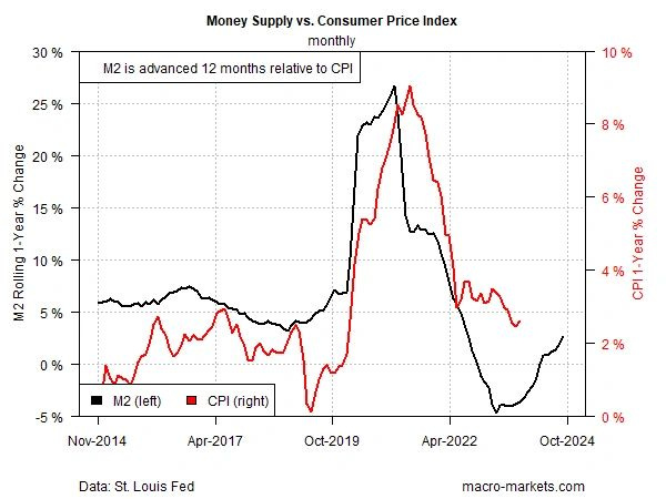 It’s debatable how much of a factor M2 will be for inflationary pressures in the New Year. Much depends on how the various Trump 2.0 policies evolve. Another key factor is whether Congress and the White House make an effort to manage the government’s deepening budget deficit. The US economy’s strength will play a key role as well.