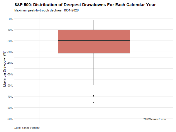 For a clearer summary of how the deepest drawdowns by calendar years compare through time, the boxplot below consolidates the historical results since 1931. The median is nearly -20% (black line). The interquartile range since is roughly -10% to -31% (shown in the box), which represents the most typical declines, statistically speaking.