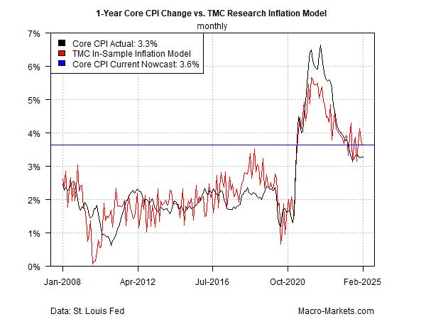 Another model developed by TMC Research highlights the possibility that core consumer inflation – a relatively robust measure of the pricing trend – will remain mostly unchanged in the near term if not tick higher. The model’s 3.6% nowcast for the one-year change in February is modestly above the actual 3.3% rise in January.