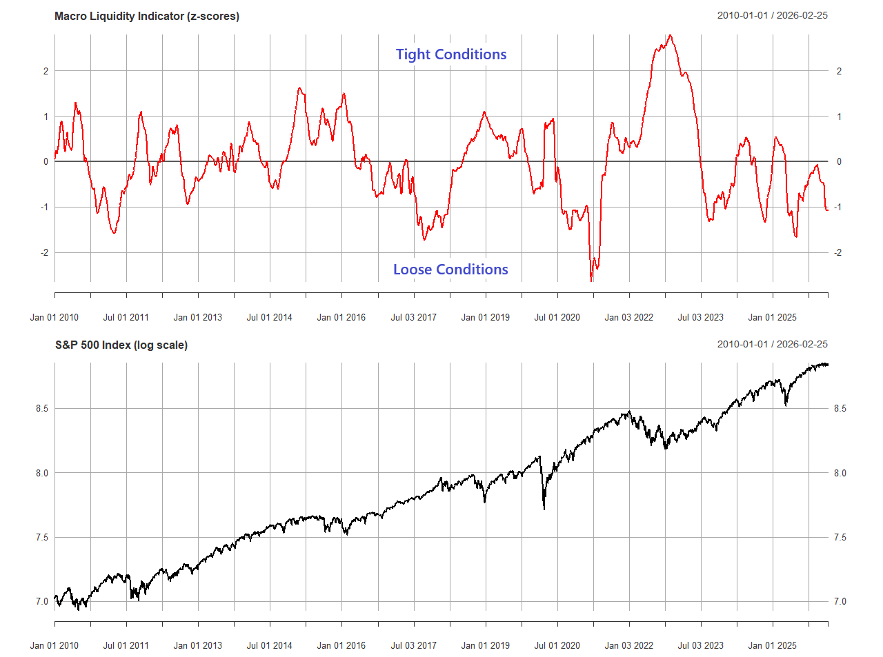 By contrast, relatively tight macro conditions on the liquidity front are usually a headwind. Ahead of the 2022 correction, for example, conditions tightened, which was likely a factor in the S&P 500 Index’s slide that year.
