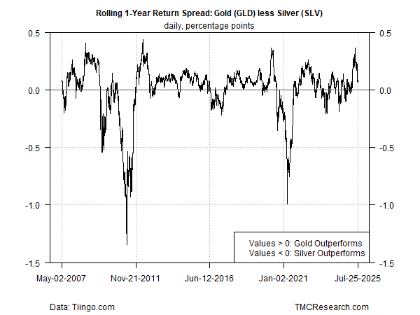 For a deeper dive, the next chart calculates the excess return for gold vs. silver via the rolling 1-year return spread. When the line is above zero, gold is outperforming over the previous year, and vice versa. Gold tends to win most of the time, but there are some notable exceptions, including two extreme periods when silver’s edge was hefty.