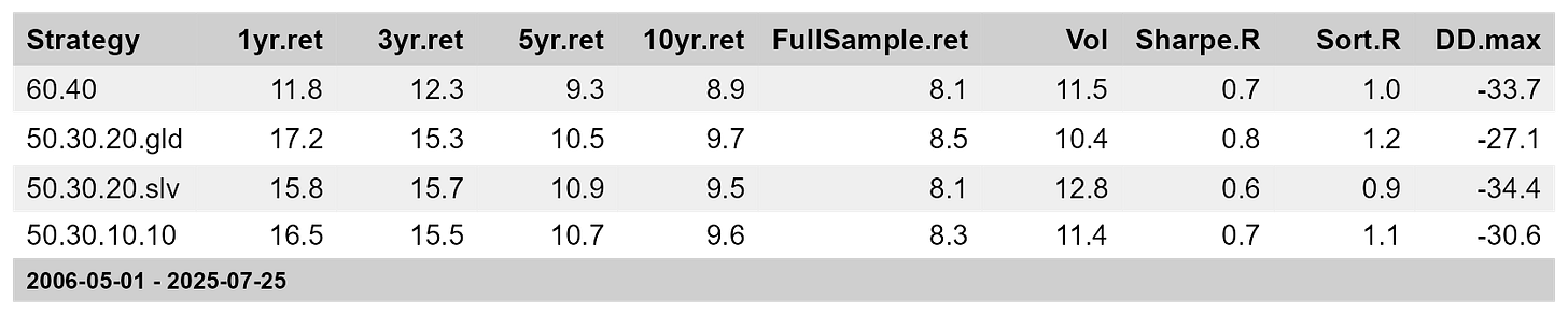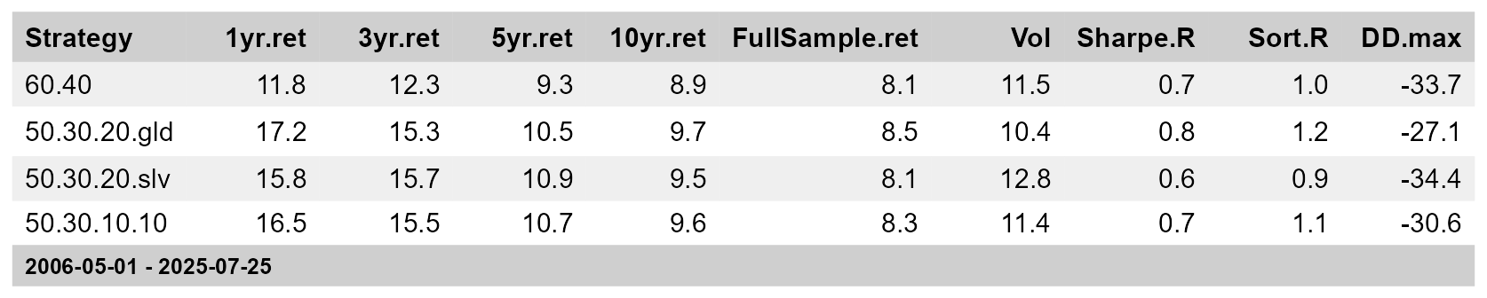 To assess how silver and gold interact within a conventional investment portfolio, we analyzed the data as follows. First, create a benchmark sans both metals: a 60/40 stock/bond portfolio (60.40 in table below), based on a pair of ETFs: SPDR S&P 500 (SPY) and iShares Core US Aggregate Bond (AGG). Next, alter the 60/40 mix with a 20% gold allocation, financed by reducing stocks to 50% and bonds to 30% (50.30.20.gld). The same silver-only allocation is shown for the 50.30.20.slv portfolio. Finally, we created a portfolio with stocks, bonds, silver and gold, with target weights of 50%, 30%, 10% and 10%, respectively (the 50.30.10.10 strategy). All portfolios have start dates of May 1, 2006 start dates and are rebalanced to target weights at the end of each calendar year.