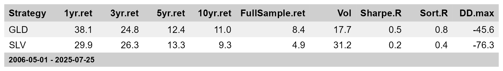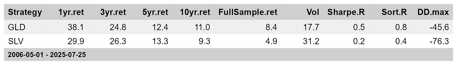 To kick the tires, we analyzed a pair of exchanged-traded portfolios that own their respective metals directly: SPDR Gold Trust (GLD) and iShares Silver Trust (SLV). The results below compare the two funds, including how they influence a simple 60/40 stock-bond portfolio.