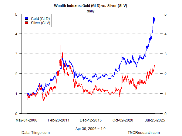 Silver is a speculative commodity in its own right, but does it also deserve consideration for portfolio design? Gold has long been viewed as the dominant choice for tail-risk hedging (providing ballast if stocks and/or bonds tumble), but silver’s role is less widely discussed. For some context on how silver compares with gold for asset allocation, TMC Research ran the numbers.