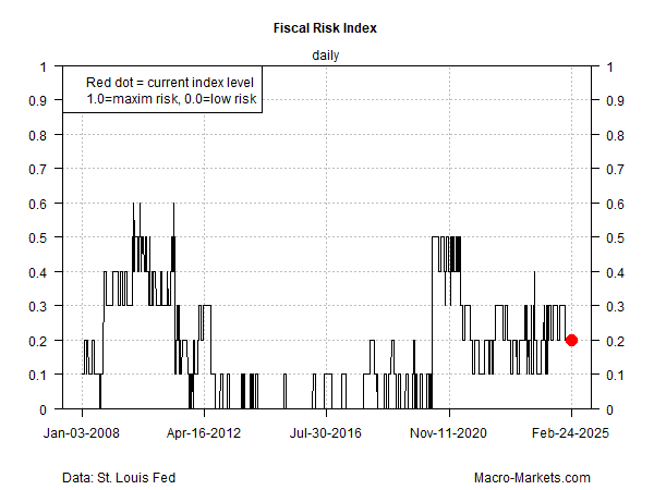 Several other indicators that are tracked in this report still leave room for debate about whether the state of us US fiscal risk has reached the tipping point. The table below lists ten indicators that are relevant for monitoring relative changes in recent history for the task of assessing the US budget situation and related variables. The Fiscal Risk Index (see chart below) aggregates the signals into a composite reading; today’s update shows that, overall, not much has changed in recent months. That’s not to say that all is well. Rather, the Fiscal Risk Index seeks to provide a running measure of how conditions have shifted through time.