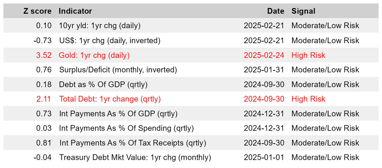 Gold and total federal debt continue to signal high risk for the US fiscal outlook.