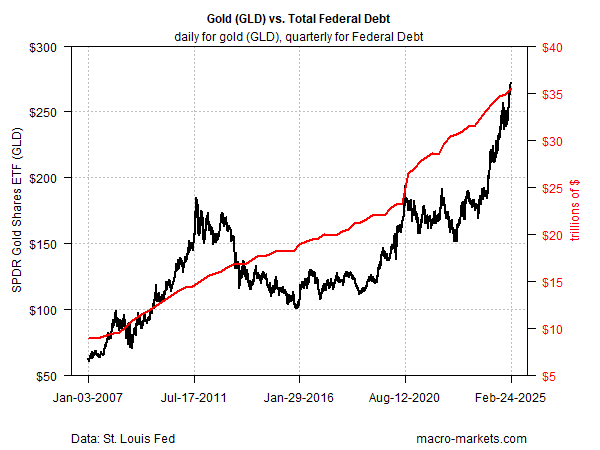 Perhaps not surprisingly, the upward path of government debt raises concerns that, left unchecked, the trend will juice inflation. One more reason for explaining gold’s rise. Comparing federal debt with the price of gold – using SPDR Gold Shares ETF (GLD) as a proxy – suggests that gold’s focus on Washington’s rising mountain of red ink is a relatively recent affair. As the chart above shows, there was a period of roughly a decade pre-pandemic when gold’s price was more or less flat while government debt continued to climb. During the pandemic, government spending soared. The year-over-year pace of growth is much lower these days, but the relentless rise of debt rolls on, and the gold market now seems to be paying attention.