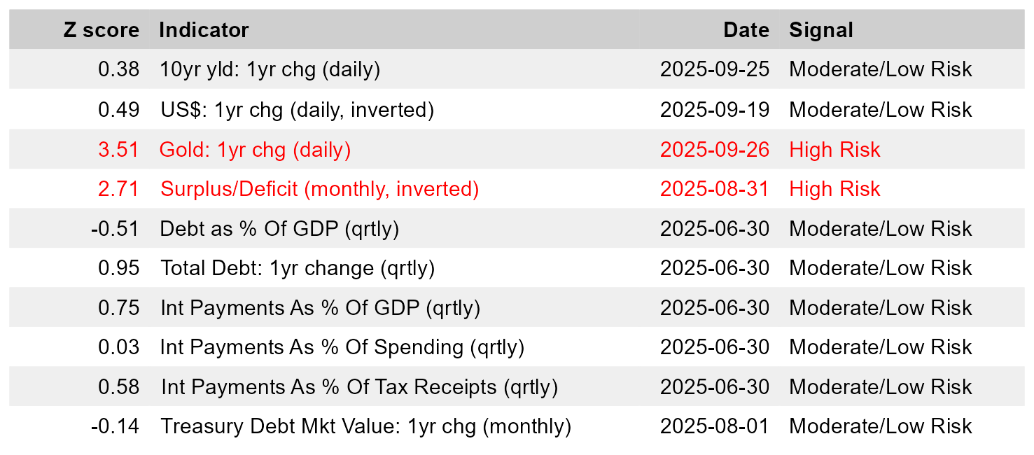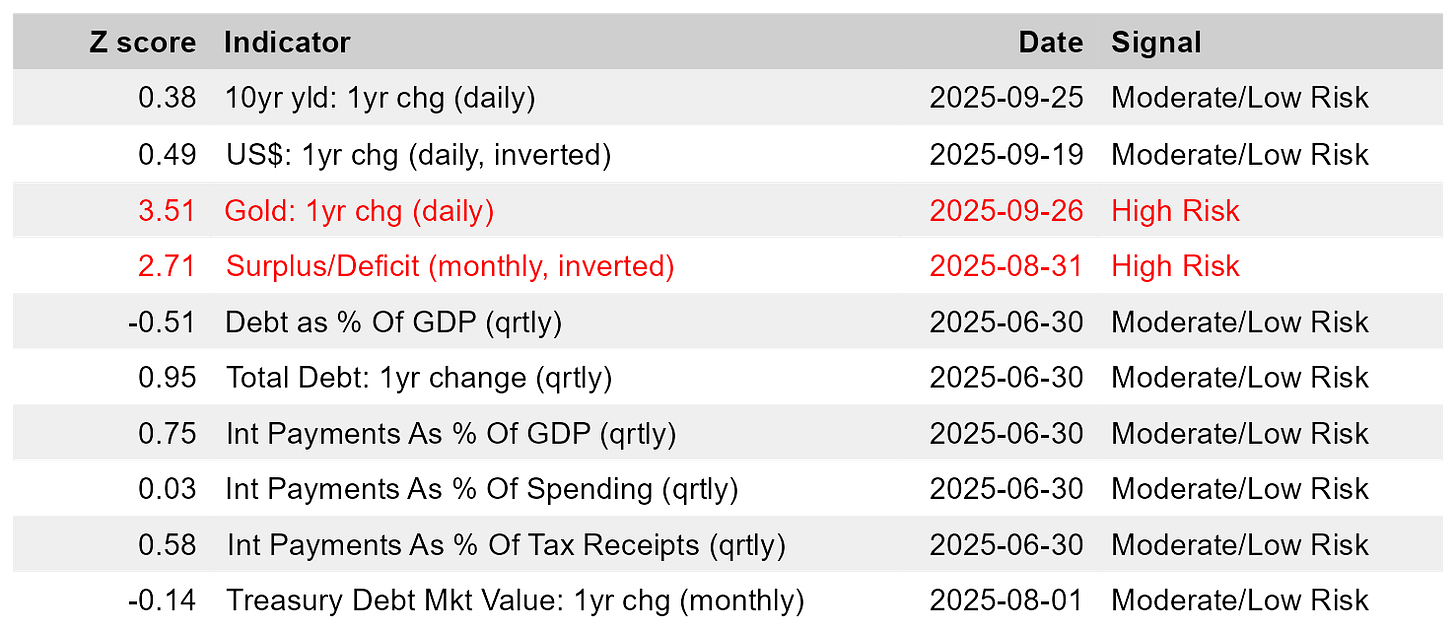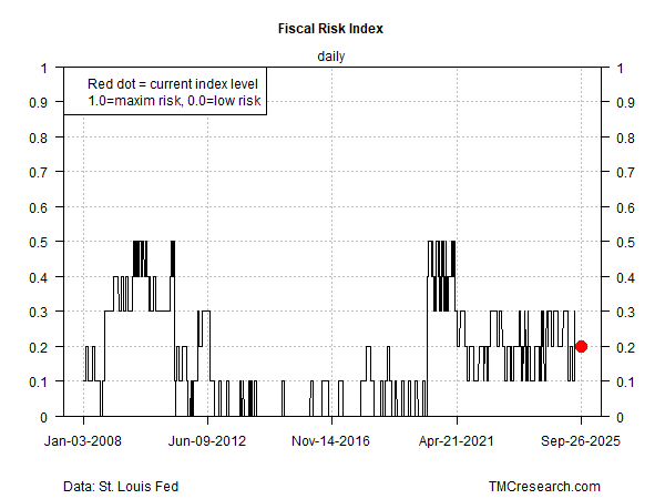 Fiscal risk has been stable lately compared with recent history, based on TMC Research’s model, which is designed to track how the overall macro and financial profile changes. On that score, the risk level remains in line with the past several years through Sep. 26.