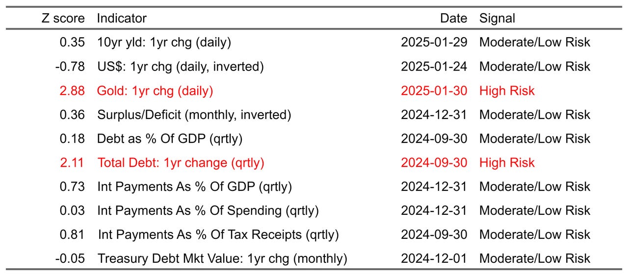 Three of the ten are market indicators – US 10-year Treasury yield, US dollar in terms of the major foreign currencies, and gold. For distinct reasons, each one of these markets is expected to be sensitive in some degree to the shifting state of US fiscal risk. The remaining seven indicators track various facets of US finances, such debt as a percentage of the economy (GDP) and the government’s monthly budget surplus/deficit.