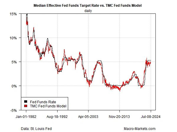 The model is designed to estimate the optimal Fed funds rate given the current state of the five factors. On that basis, policy is overly tight, which suggests the central bank is raising the risk of slowing growth, perhaps to the point of tipping the economy into recession.
