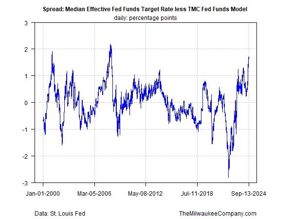 As previously reported, the spread for the current Fed funds target rate less the TMC model estimate has surged to 171 basis points -- the widest level since 2008. As we write, the gap continues to expand. In the days since our Aug. 29 note, the spread has increased 21 basis points.