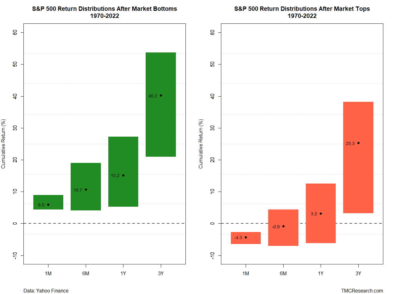For a primer on how theses timing decisions stack up, we calculated 1-month, 6-month, 1-year and 3-year returns following market tops and bottoms for the S&P 500 starting in 1970 and ending in 2022 (the last year available for subsequent 3-year data through today). The results, shown in the charts below, align with expectations, namely: It’s generally preferable to buy around market corrections. But there are some caveats to consider. (Note: black dots in each bar indicate the median return for that time horizon.)