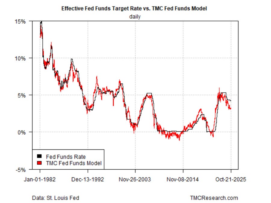 TMC Research’s Fed funds model continues to indicate that monetary policy remains moderately tight. The effective Fed funds rate has been holding steady recently at roughly one percentage point above our neutral estimate. The gap leaves room for the Fed to cut while still leaving policy with a hawkish bias.