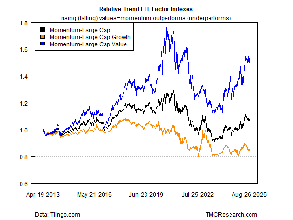 Finally, consider how the momentum factor fares against various slices of large-cap. Here, too, it’s obvious that momentum’s trend cycle can and does vary, sometimes substantially, depending on the definition of the large-cap factor. Relative to large-cap value, momentum’s outperformance in recent history has been strong. By comparison, momentum’s strength vs. large-cap growth has been mixed over the past couple of years.