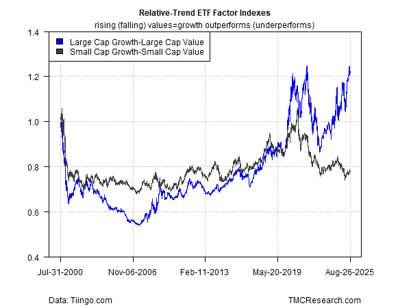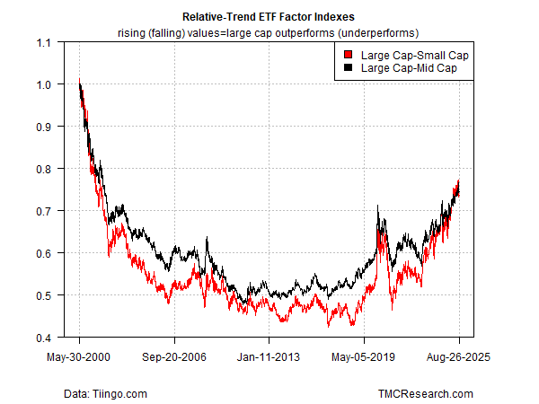 ETFs have democratized factor investing and so a lot of the mystery has been revealed over the years in terms of publicly available information. But a closer look at relative trend cycles can still be useful – the relative performance difference between, say, large-cap and small-cap stocks. This data isn’t widely followed, at least for some factor relationships, but it deserves to be. Recognizing that a trend may be reversing or accelerating is valuable insight for portfolio design and management.