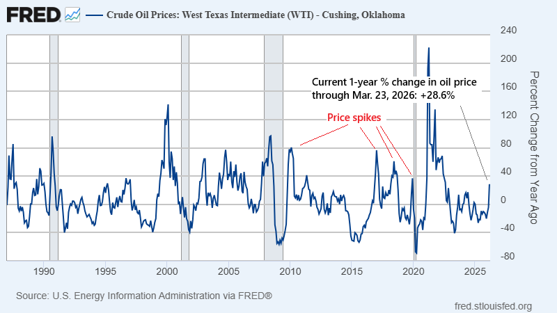 It’s also worth noting that the current increase in oil — approaching a 30% year‑over‑year gain, based on prices through Mar. 23 — is a hefty change from recent history. But the increase, so far, is still well below changes associated with the three recessions prior to the pandemic, which was unusual in the extreme and therefore of limited value for studying business‑cycle behavior.