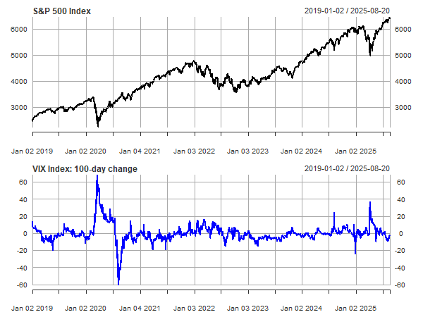 As a filter to emphasize signal, it’s helpful to measure how the VIX has shifted in recent history. In this example, a rolling 100-day change provides context that can be obscured by looking at the index directly. A spike above 20 points for the VIX suggests that most or all of a volatility surge has passed. The intuition here is that after market volatility has spiked substantially, the odds are low that it will spike further, courtesy of the mean-reverting characteristic of the VIX. Note, however, that this methodology is less effective in the context of longer market declines. The 2022 correction for the S&P 500, for instance, was reflected in the VIX as a series of relatively moderate but ongoing volatility jumps. In other words, sharp vol spikes don’t accompany every market decline. Sometimes a long, slow grind lower prevails, in which case other analytics are needed, such as the first two approaches above.