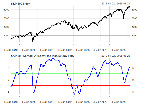 A related metric smooths out some of the noise in the chart above with a pair of moving averages. The second chart below uses the percentage difference between the 50- and 200-day moving averages of the S&P 500 for guidance. Recent history suggests that when this spread falls below -2.5 percentage points (red line), the odds look favorable for expecting that the storm has passed.