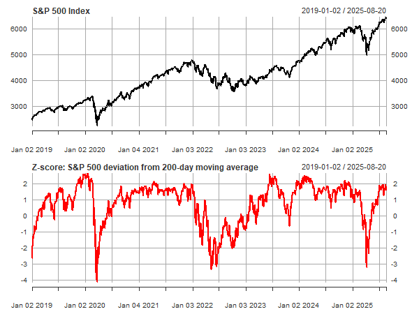 The first example uses the S&P’s deviation from its 200-day moving average, with the results transformed to z-scores – a statistical measure that indicates how many standard deviations a given data point varies from the average. For context, keep in mind that 68% of values in a normal distribution are within 1 standard deviation (1σ), 95% within 2σ, and 99.7% within 3σ. The caveat is that stock prices (and returns) aren’t normally distributed, and so the use of z-scores has limitations. Nonetheless, looking at market behavior through a z-score lens is a useful first approximation.