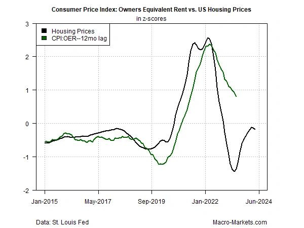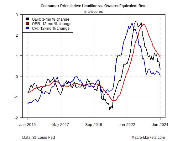 As shown in the chart below, the 3-month change in OER through June (black line) has dropped sharply. That’s an encouraging indicator for expecting that the recent slide in CPI’s annual pace will ease further, and perhaps at a faster rate, in the months ahead. (Note: the changes in the chart are cited in z-scores, which allows for easier visual comparisons in a chart by putting all the data sets on a comparable scale.)