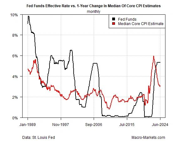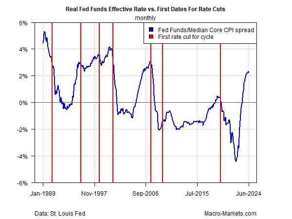 Skeptics might wonder if the rate-cut forecasts find support in the inflation data? One way to approximate an answer is by comparing the real (inflation-adjusted) Fed funds rate to the actual inflation numbers. As shown in the analysis below, the case on this front supports the market’s expectation that a new rate-cutting cycle may be near.
