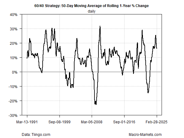 The warnings in recent years from some analysts that the 60%/40% stock/bond benchmark portfolio is dead haven’t aged well.