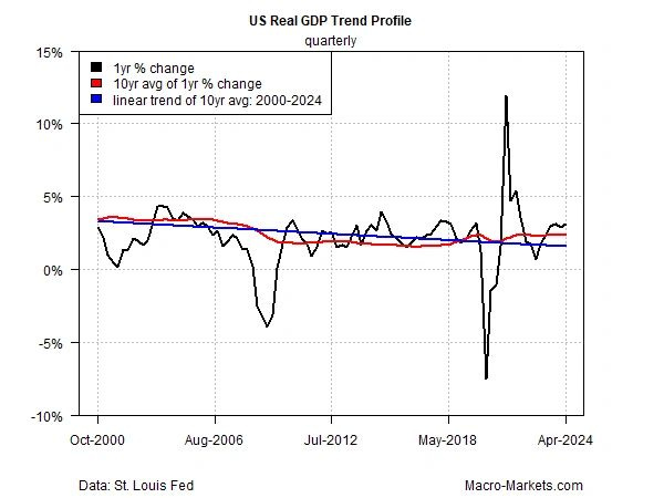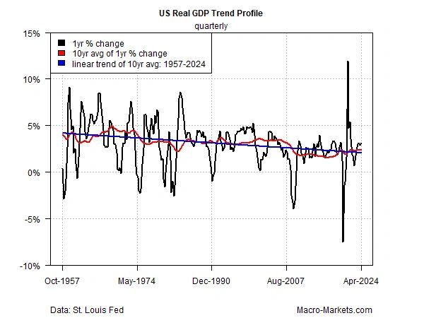 As the first chart reminds, the rate of growth in real gross domestic product (GDP) has been trending lower over much of the past half-century-plus. During shorter periods it’s easy to overlook the deceleration, which can and has given way to relatively firmer growth for short periods. But profiling GDP across the years shows a clear downtrend.
