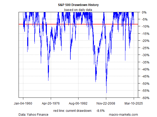 The question is whether the current incarnation of trade-war risk that’s weighing on market sentiment persists and leads to a deeper drawdown? That’s challenging to forecast, to say the least, primarily because the market’s path ahead is heavily dependent on President Trump’s future decisions on trade policy. Given his mercurial nature, it’s fair to say that deciding what’s likely on this front is highly uncertain.