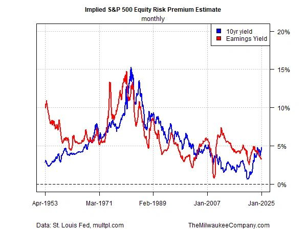 The subject is timely as the trailing earnings yield for the S&P 500 Index continues to slide below the recently rising US 10-year Treasury yield. The January estimate for the S&P earnings yield is roughly 3.30%, well below the 10-year yield, which trades at around 4.60% in mid-afternoon trading today. The gap in favor of the 10-year note suggests that the long-run risk premium for stocks is negative.