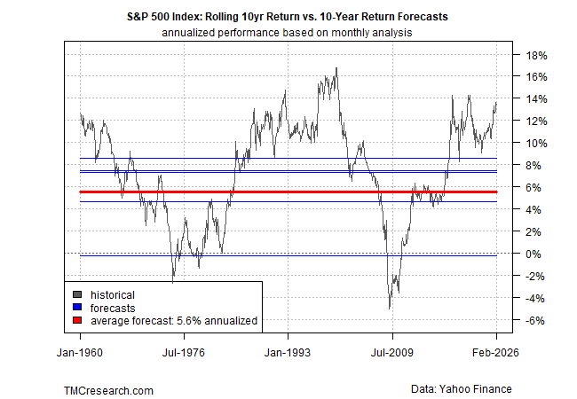 The future’s always uncertain, but it’s useful to run the numbers on several models to review changes in expectations vs. how the current outlook compares with history. TMC Research updated the five models that we routinely monitor and the results indicate that the S&P 500’s expected return for the decade ahead still looks relatively modest next to the sizzling run in recent history.