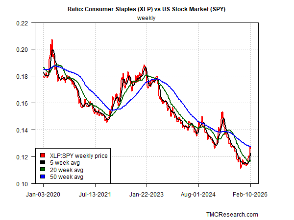 One trend that has changed is that of consumer staples stocks (XLP) relative to the broad market (SPY). This ratio is useful to monitor because a shift here can signal periods of elevated market stress, which sometimes favors shares of consumer staples as relative safe havens compared with stocks overall. Note the sharp upturn in the ratio in the chart below, which may be an early indication that the risk appetite for the market is starting to turn defensive. Although the change to date has yet to signal a clear shift, this ratio deserves close attention in the weeks ahead.