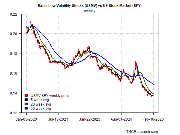 Another approach for tracking risk sentiment is watching the relative performance of low-volatility stocks (USMV) vs. the broad market (SPY). Low-vol shares are considered relatively defensive vs. equities in general, but by this measure the trend suggests that the risk-on signaling of recent history rolls on. As such, the USMV-SPY ratio introduces a degree of doubt about the shift toward defensive stocks as discussed above.
