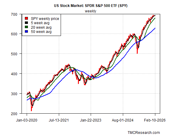 Looking at the broad trend for the S&P 500 (SPY) via weekly prices highlights an extension of the bull run that was unfolding in our previous update in November. The current profile offers no assurance of higher prices, but it does indicate that the upside bias that was intact in our last update remains intact today.