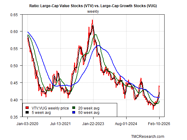 A similar reversal has unfolded recently for value (VTV) over growth stocks (VUG) in the large-cap space. If the rebound in this ratio persists, it may signal an extended run of outperformance for value stocks. A key metric to watch that would strengthen that transition: a rise in the 20-week average above the 50-week average. Although that change doesn’t look imminent, the rise in the shorter-term averages suggests that the odds are looking more favorable for that transition in the near term.