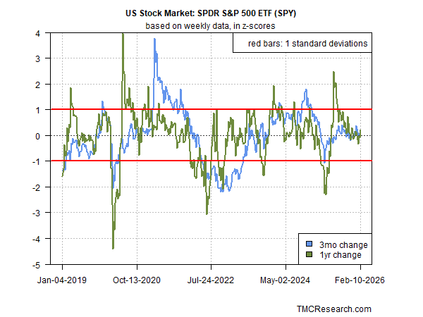 TMC Research reviewed several trend metrics for the US stock three months ago and found that while valuation concerns continued, there was “no decisive shift in market’s upward momentum.” Since then, equities are up roughly 5%, based on the S&P 500 Index. Let’s update the analytics to see what’s changed, based on a set of ETFs.