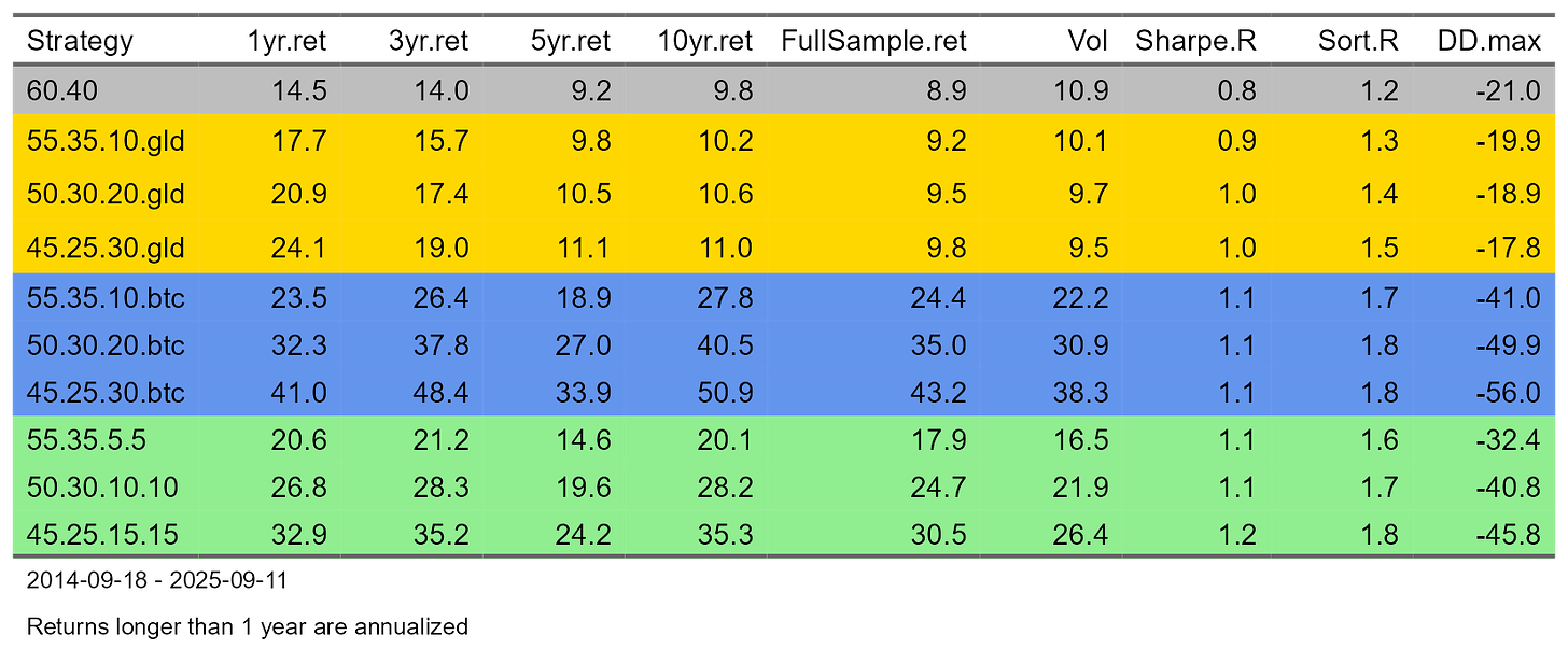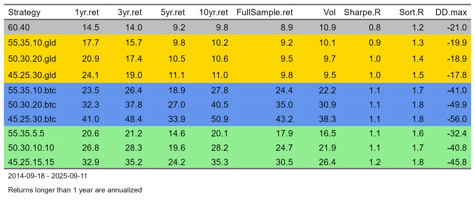 For the third set of strategy tests, portfolios hold equal weights in gold and bitcoin and lower amounts of stocks and bonds (green rows). For instance, one variation of the 60/40 portfolio is revised so that stocks and bonds are cut to 55% and 35% weights, respectively, with 5% shifting to gold and 5% to bitcoin (55.35.5.5 strategy).