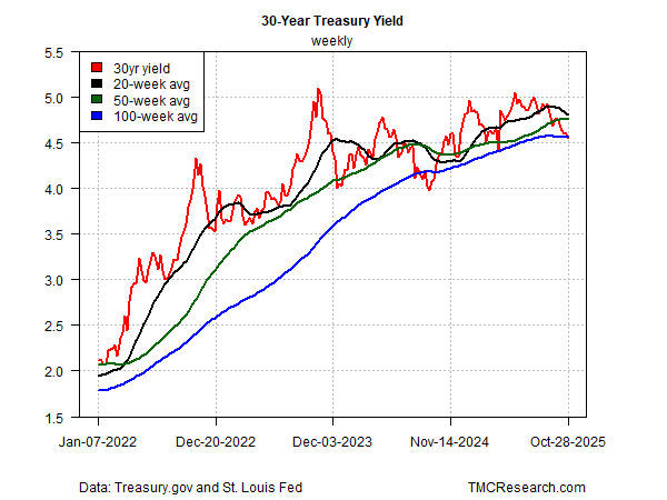 The 30-year yield is a useful proxy for monitoring inflation concerns, and on that front the trend still looks friendly, based on a weekly measure, which reduces some of the short-term noise.