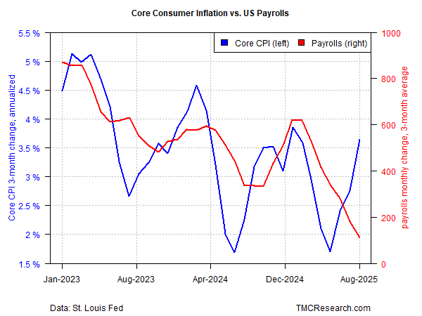 A problem for policy arises when the trends diverge, namely: inflation accelerates and employment weakens. In that case, focusing on one policy concern threatens to exacerbate the other. Raising rates helps cool inflation, but threatens to weigh on an already weak hiring trend. The opposite challenge: cutting rates to support the labor market, which is problematic if inflation is picking up, and so easing policy can strengthen an existing run of reflationary pressure. Damned if you do, damned if don’t.