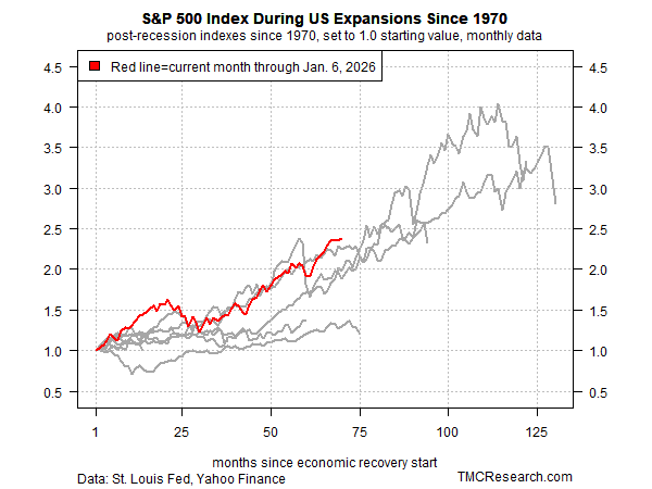 More than a year ago, TMC Research noted that the outlook for stocks remained positive, in part because the risk of recession appeared low. Fast forward to today, and the S&P 500 Index is up 19% since those remarks were published and closed at a new record high on Tuesday (Jan. 6). Although the catalysts for higher share prices extends beyond the business cycle proper, it’s fair to say that economic growth promotes and supports bullish conditions, creating fertile ground for growing corporate earnings, for instance.