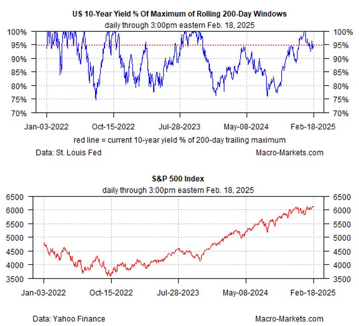 By that measure, this 10-year-yield indicator’s 95% reading (as of 3:00 pm eastern on Feb. 18) continues to signal elevated risk for stocks. Generally, a reading above 95% can be viewed as a warning. Like any risk metric, it’s hardly flawless as a predictor, although it does post an encouraging history of highlighting periods when the odds look relatively high(er) for a weak run in stocks in the near term.