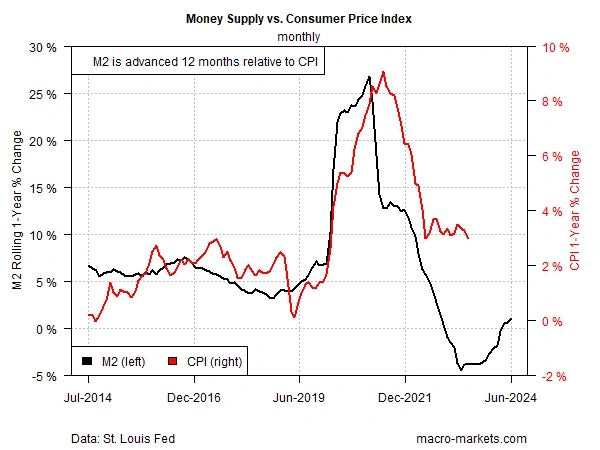 But using the M2 trend as a proxy for what lies ahead continues to suggest that disinflation still has a tailwind. That outlook implies that there’s a reasonable case for expecting that the Federal Reserve will soon begin cutting interest rates as the threat of inflation continues to fade.
