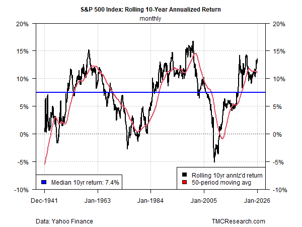 A reasonable place to start is with the rolling 10-year annualized return. To further filter out some of the noise, the chart below uses monthly data to calculate S&P 500 Index performance. The current 10-year return is a strong 13.6% annualized increase (based on data through Jan. 14, 2026). That’s among the best gains for the 10-year window on record, ranking in the top decile for the past eight decades.