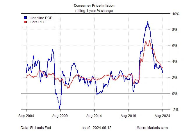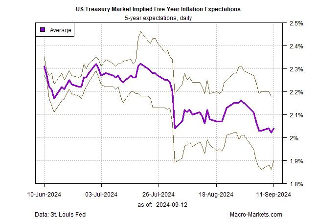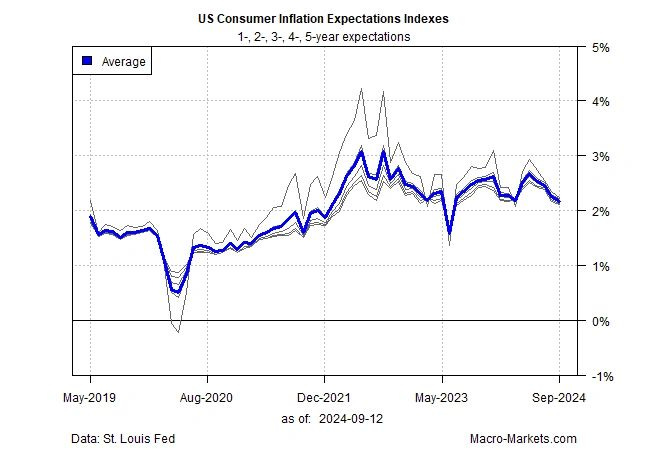 Supporting evidence that inflation is expected to remain relatively contained and will hold steady if not trend lower: modest inflation expectations. The Cleveland Fed’s inflation expectations model, for instance, continues to reflect easing estimates for future expectations. The median estimate ticked down to 2.2% for September, the fourth straight monthly decline.